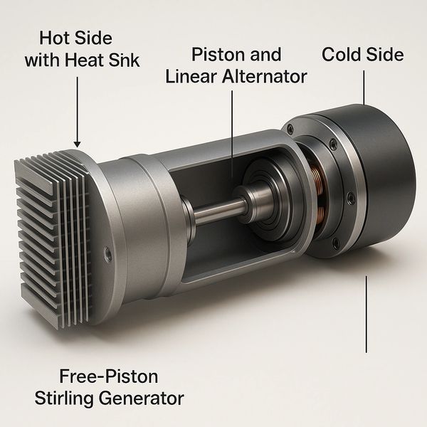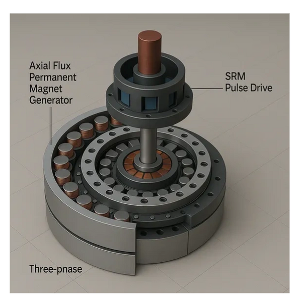 Sterling units, combined with TEG arrays and the fan turbine, harvest waste heat to generate enough power to drive the SRM pulse motor, AFPMG, and support the full system load—enabling high-efficiency, off-grid operation.